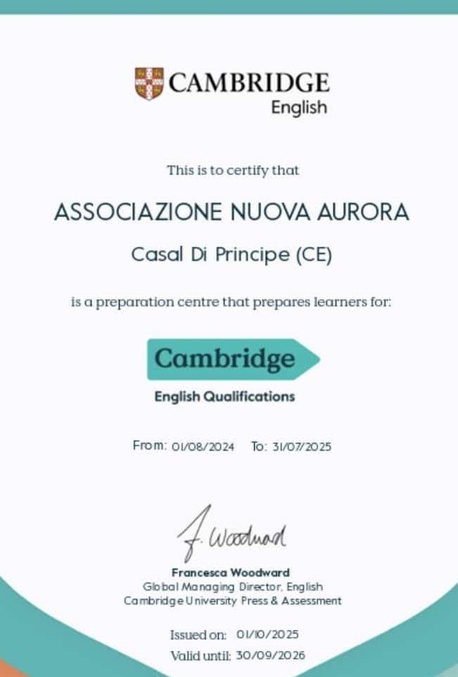 L’Associazione Culturale Nuova Aurora è Centro di Preparazione Cambridge English, riconosciuto ufficialmente per la preparazione alle certificazioni internazionali di lingua inglese.